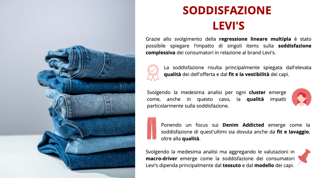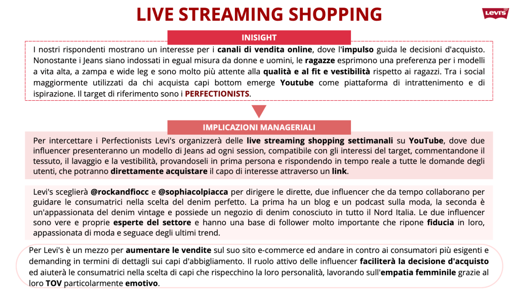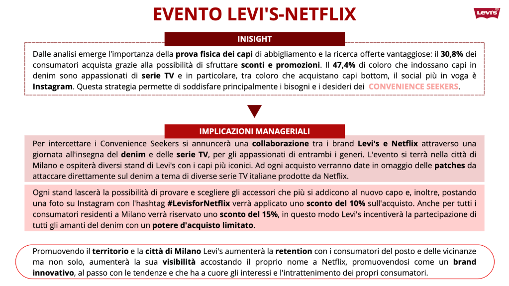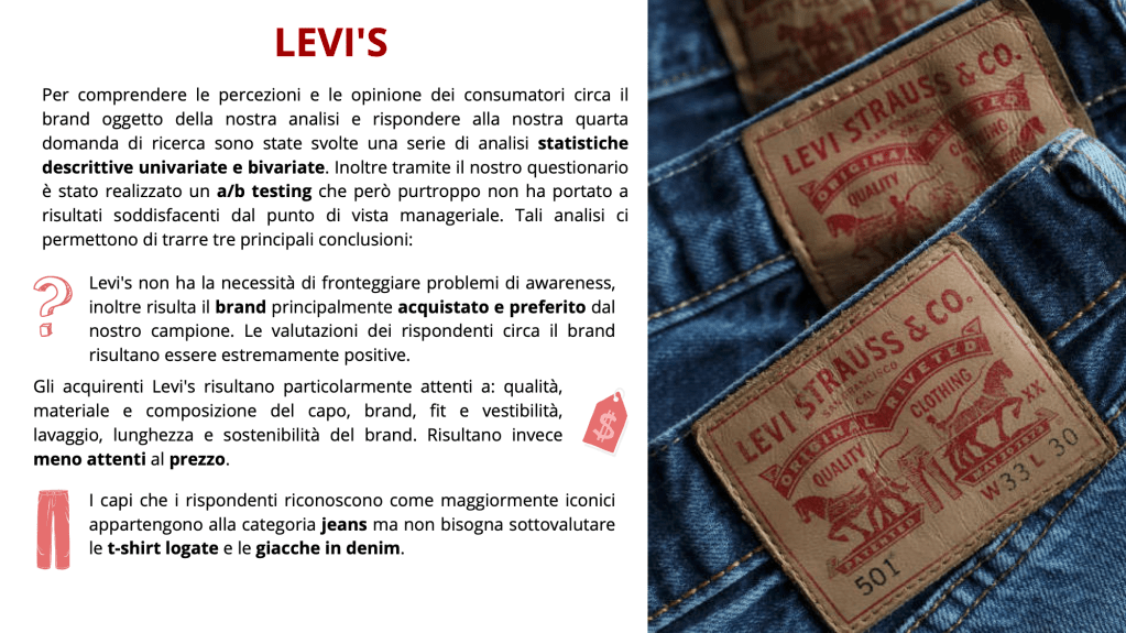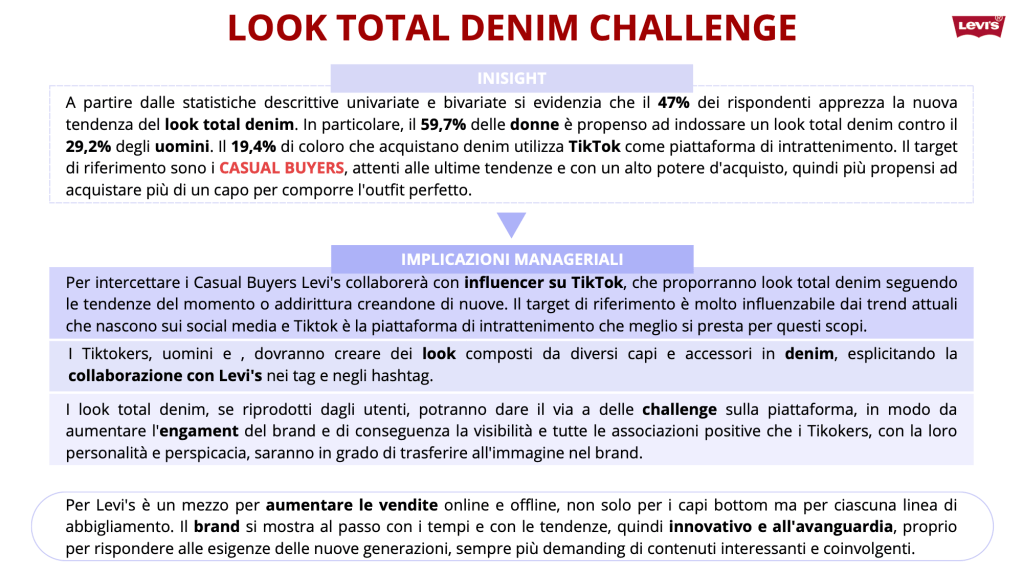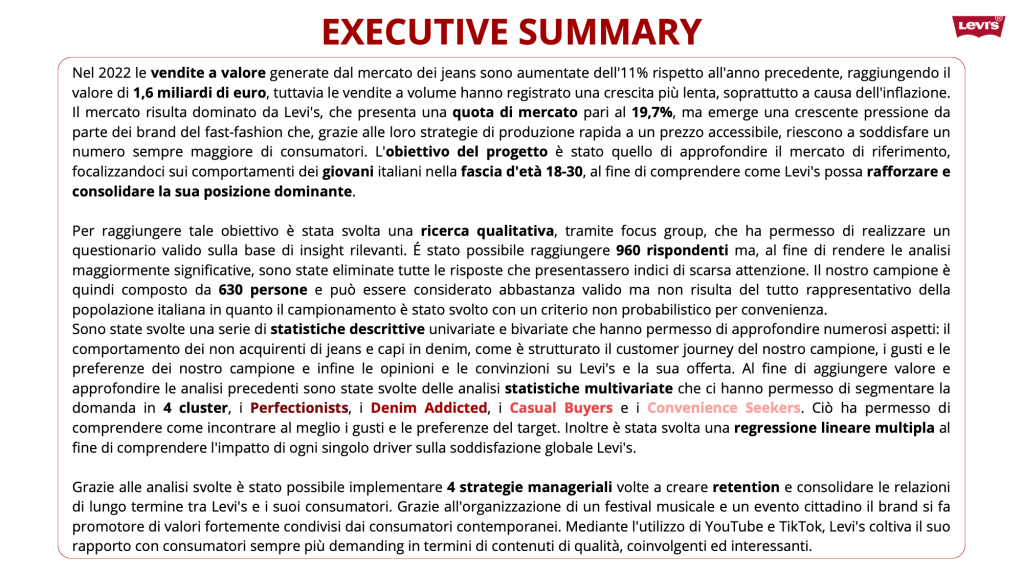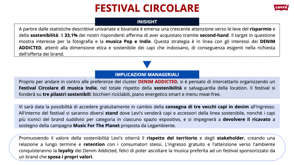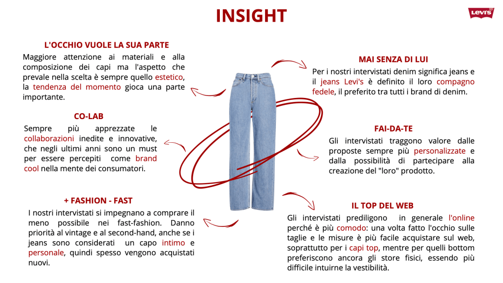 Dalle analisi del questionario è emerso come i rispondenti mostrino una preferenza per i canali di vendita online, dove le decisioni d’acquisto sono dettate dall’impulso. Nonostante i Jeans siano indossati in egual misura da donne e uomini, le ragazze esprimono una preferenza per i modelli a vita alta, a zampa e wide leg e sono molto più attente alla qualità e al fit e vestibilità dei pantaloni. Tra i social utilizzati da chi acquista capi bottom, emerge Youtube come piattaforma di intrattenimento e di ispirazione principale. I rispondenti valutano molto bene il brand Levi’s, che non ha bisogno di aumentare la propria awareness. Il campione è stato suddiviso in quattro gruppi omogenei, ognuno dei quali rappresenta un target con tratti peculiari: i perfectionists, i casual buyers, i denim addicted ed i convenience seeker. Sono state realizzate quattro strategie ad hoc per incontrare le esigenze e gli interessi di ciascuno di loro. Le strategie sono volte a creare retention e consolidare le relazioni di lungo termine tra Levi’s e i suoi consumatori. Grazie all’organizzazione di un festival musicale e un evento cittadino il brand, si fa promotore di valori fortemente condivisi dai consumatori contemporanei. Mediante l’utilizzo di YouTube e TikTok, Levi’s coltiva il suo rapporto con consumatori sempre più demanding in termini di contenuti di qualità, coinvolgenti ed interessanti.