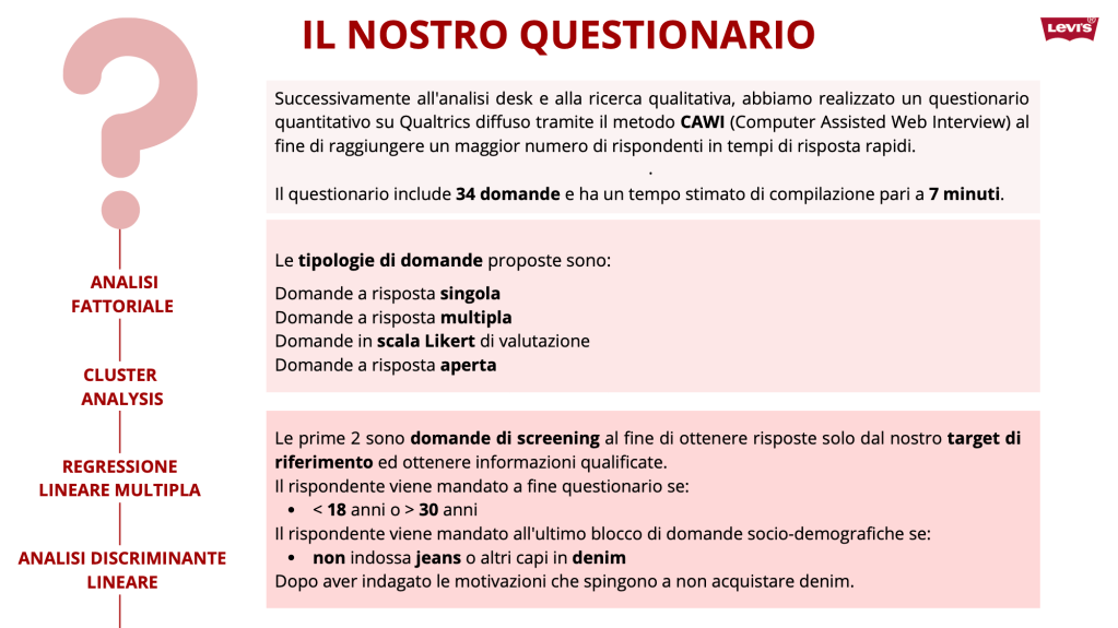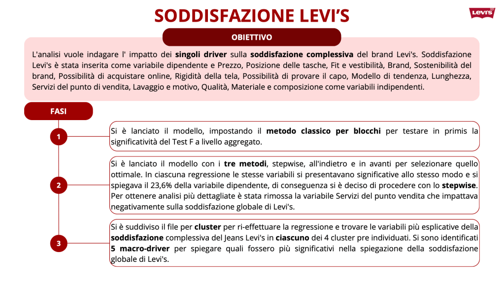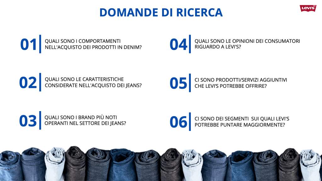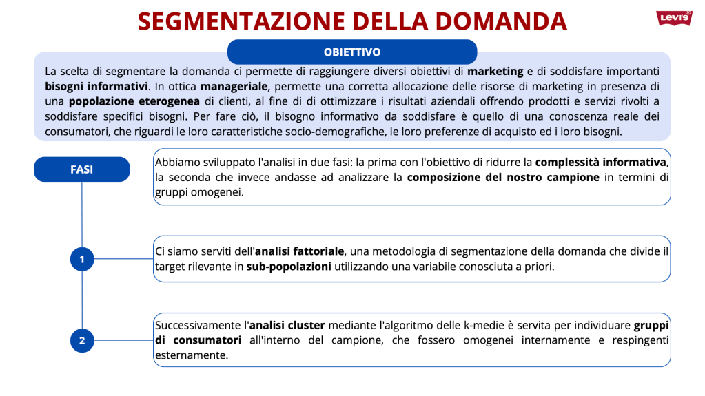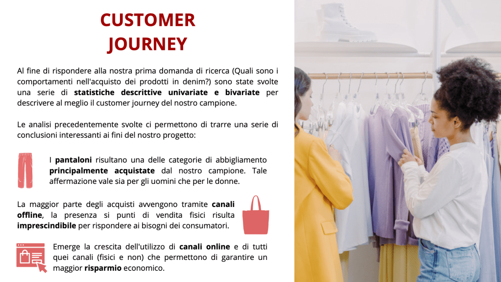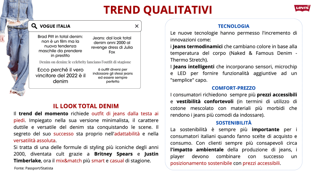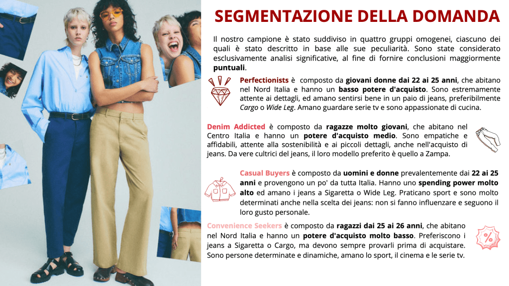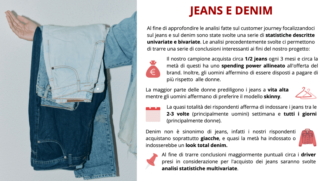 Dalle analisi del questionario è emerso come i rispondenti mostrino una preferenza per i canali di vendita online, dove le decisioni d’acquisto sono dettate dall’impulso. Nonostante i Jeans siano indossati in egual misura da donne e uomini, le ragazze esprimono una preferenza per i modelli a vita alta, a zampa e wide leg e sono molto più attente alla qualità e al fit e vestibilità dei pantaloni. Tra i social utilizzati da chi acquista capi bottom, emerge Youtube come piattaforma di intrattenimento e di ispirazione principale. I rispondenti valutano molto bene il brand Levi’s, che non ha bisogno di aumentare la propria awareness. Il campione è stato suddiviso in quattro gruppi omogenei, ognuno dei quali rappresenta un target con tratti peculiari: i perfectionists, i casual buyers, i denim addicted ed i convenience seeker. Sono state realizzate quattro strategie ad hoc per incontrare le esigenze e gli interessi di ciascuno di loro. Le strategie sono volte a creare retention e consolidare le relazioni di lungo termine tra Levi’s e i suoi consumatori. Grazie all’organizzazione di un festival musicale e un evento cittadino il brand, si fa promotore di valori fortemente condivisi dai consumatori contemporanei. Mediante l’utilizzo di YouTube e TikTok, Levi’s coltiva il suo rapporto con consumatori sempre più demanding in termini di contenuti di qualità, coinvolgenti ed interessanti.