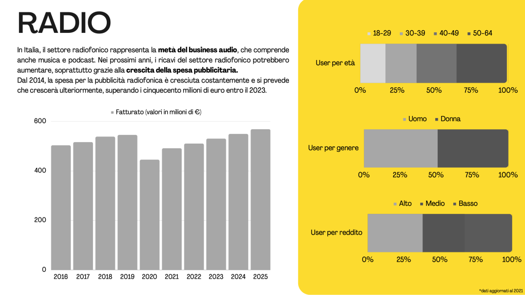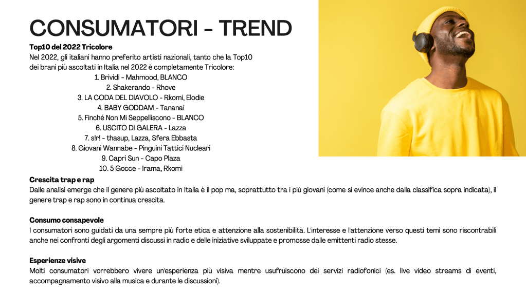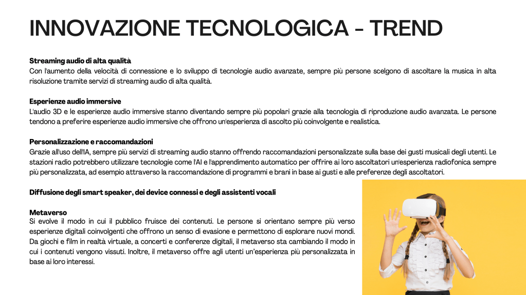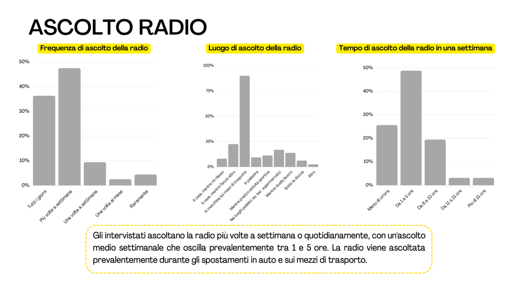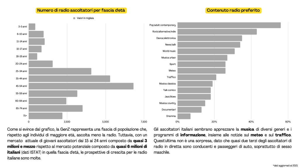 La sempre maggiore pervasività delle piattaforme di streaming musicale, la diffusione dei podcast e l’utilizzo sempre più intenso dei dispositivi mobili, oltre alla crescente competizione tra le molteplici emittenti radiofoniche, generano non poche sfide per le radio tradizionali. In particolare, ad oggi, conquistare il target più giovane di ascoltatori rappresenta una difficoltà di non poco conto, considerate anche le loro preferenze in termini di tematiche e piattaforme utilizzate.