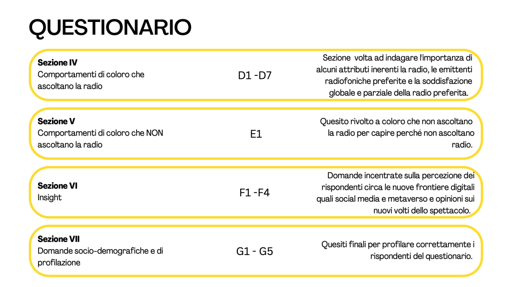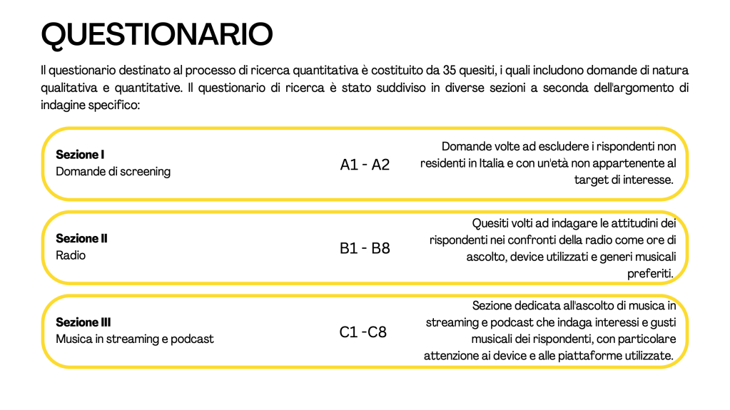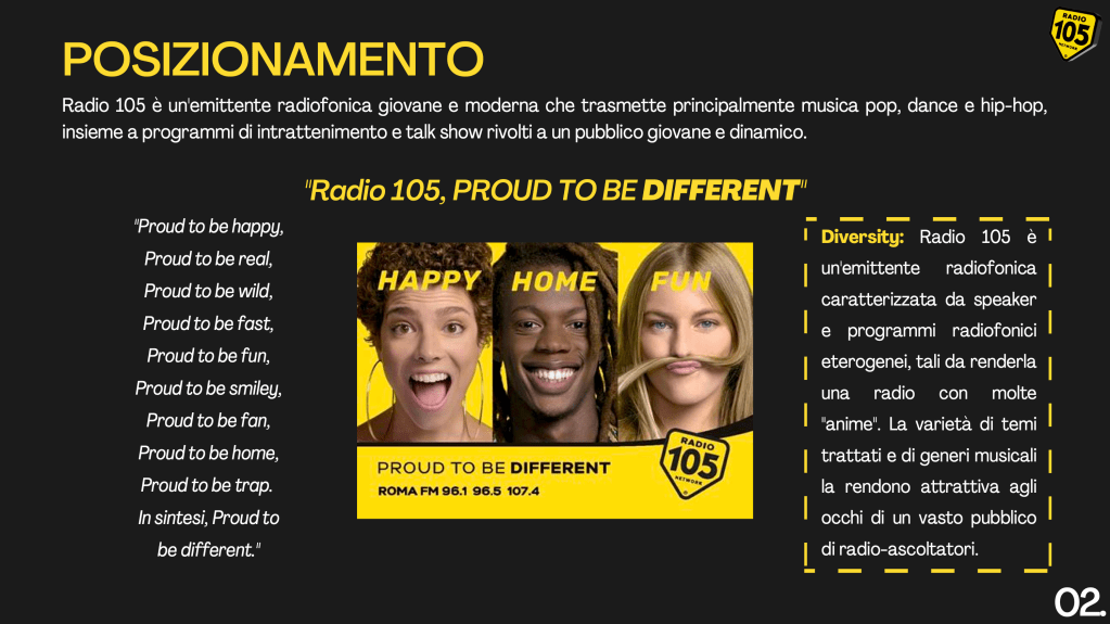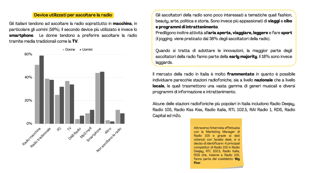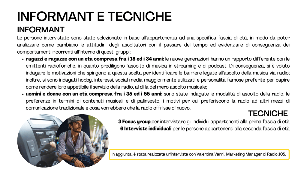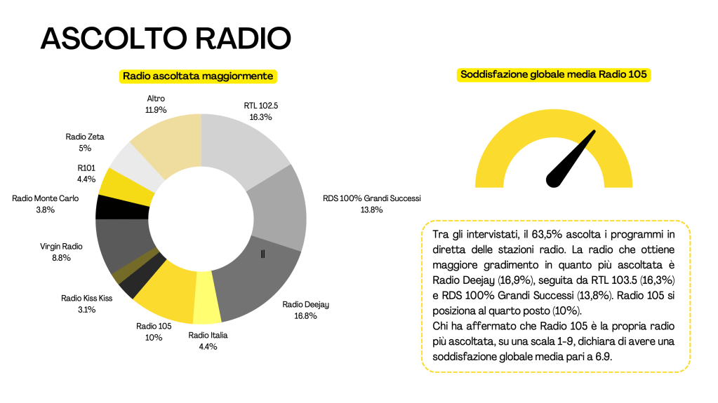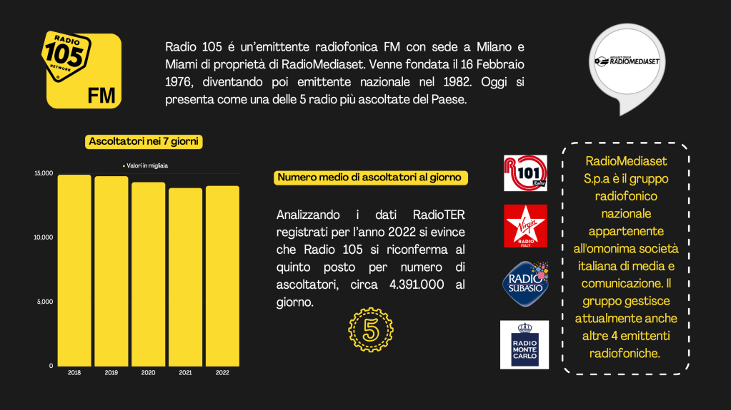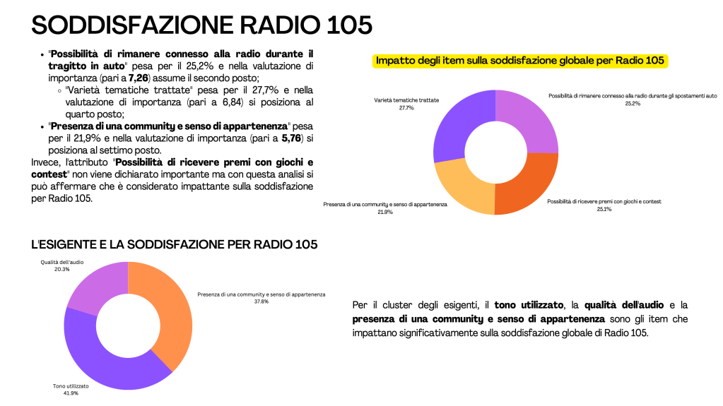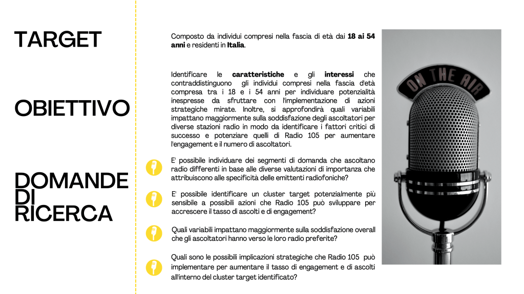 Questo report ha l’obiettivo di identificare le caratteristiche e gli interessi dei radioascoltatori e potenziare i fattori critici di successo di Radio 105 in modo da aumentare l’engagement e il numero di ascoltatori dell’emittente radiofonica di proprietà di Mediaset.