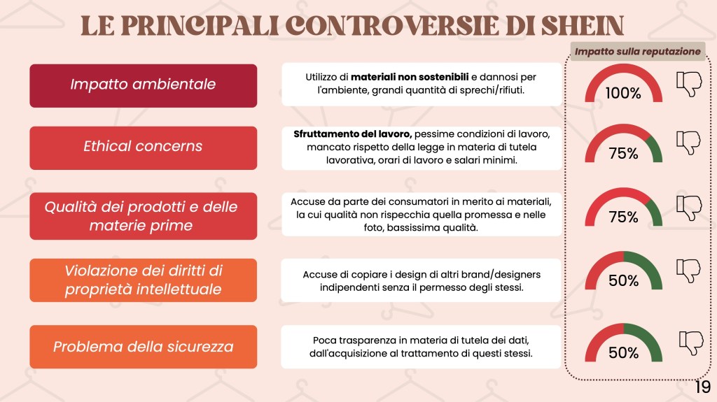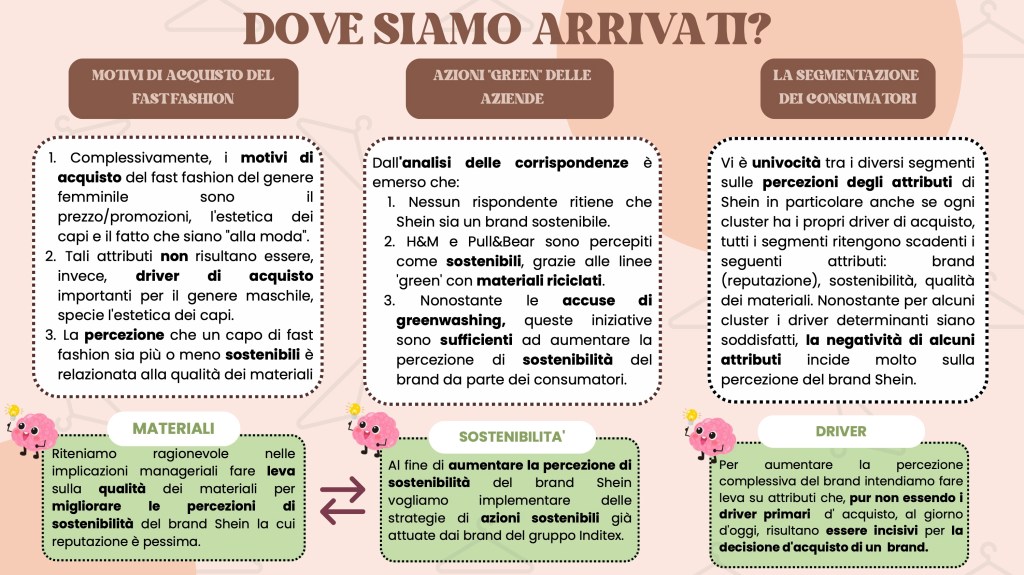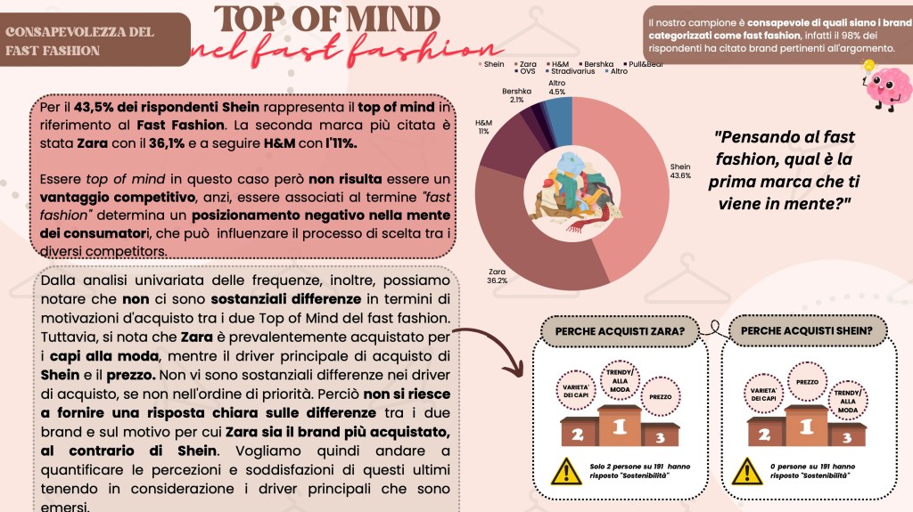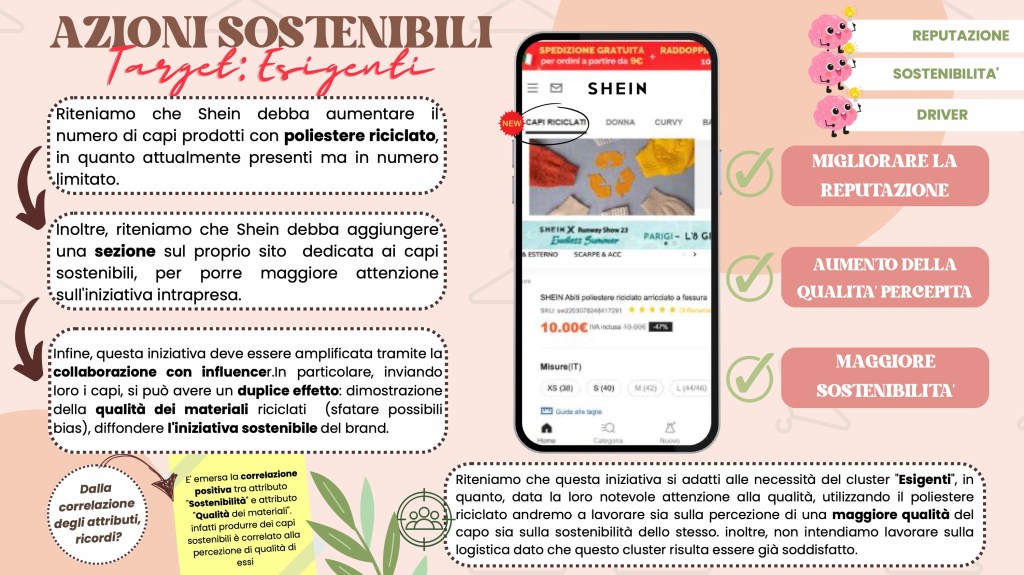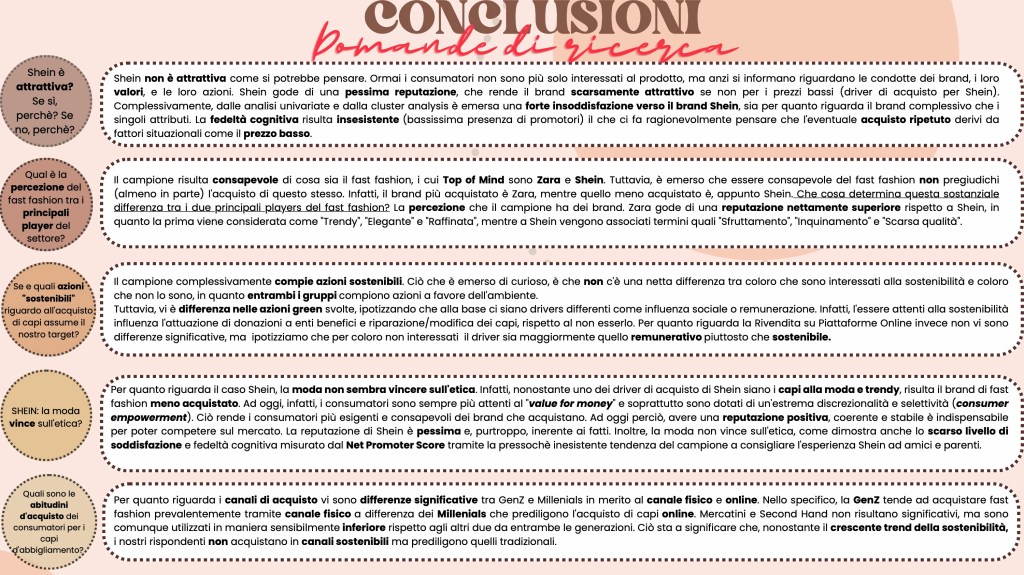 Analizzando il caso Shein, si evince chiaramente che la moda non sembra vincere né sulla sostenibilità né sull’etica. Infatti, nonostante uno dei driver di acquisto di Shein siano i capi alla moda e trendy, esso risulta il brand di fast fashion meno acquistato. Ad oggi, infatti, i consumatori sono sempre più attenti al “value for money” e soprattutto sono dotati di un’estrema discrezionalità e selettività (consumer empowerment). Ciò rende i consumatori più esigenti e consapevoli dei brand che acquistano in relazione al rispetto dell’ambiente e del capitale umano. Oggigiorno, avere una reputazione positiva, coerente e stabile è indispensabile per poter competere sul mercato e, purtroppo, la reputazione di Shein è pessima.