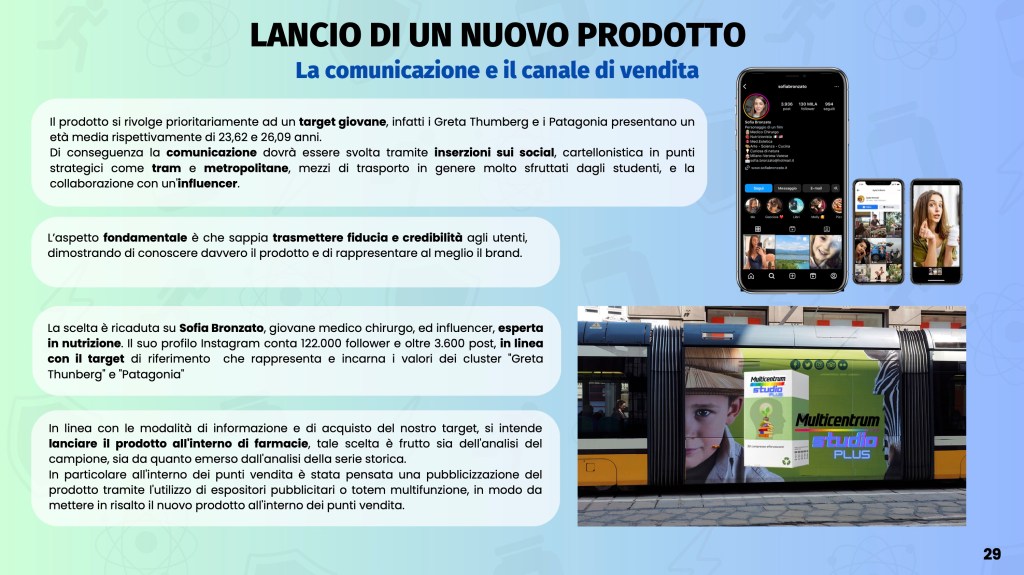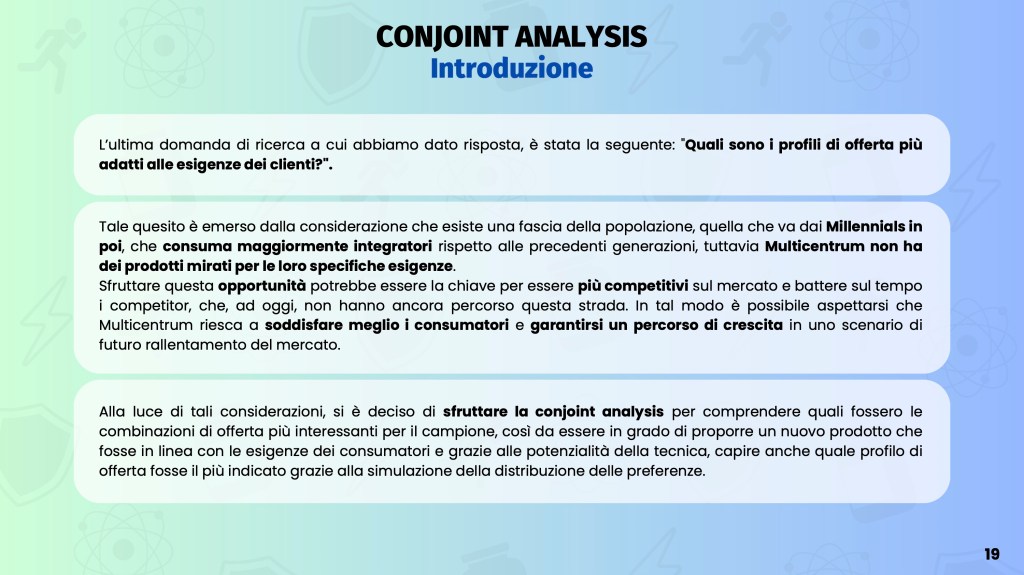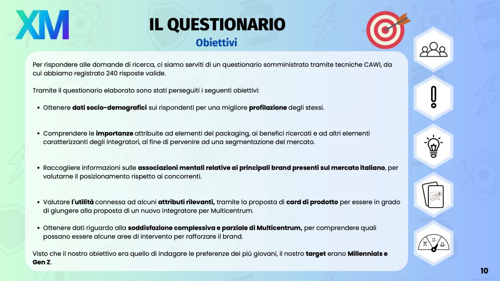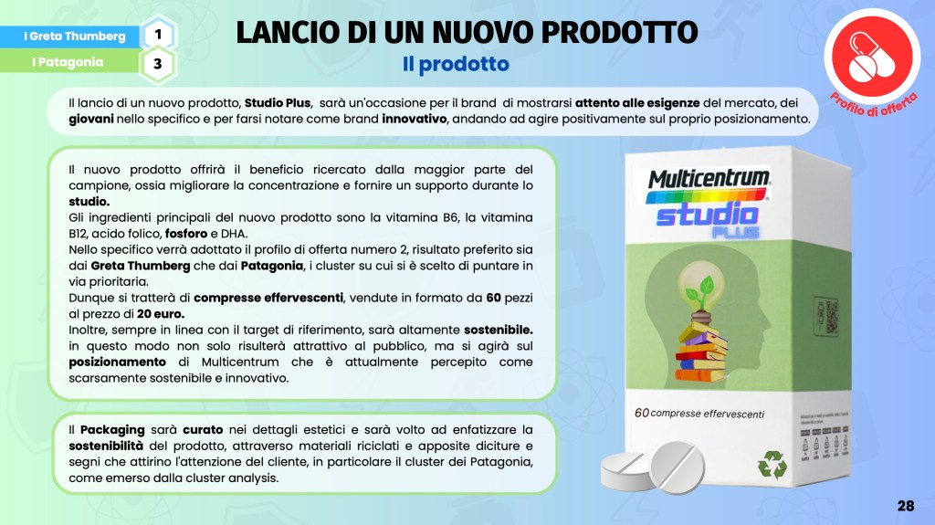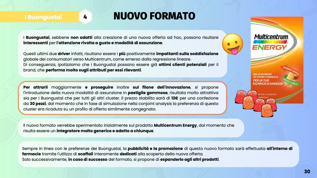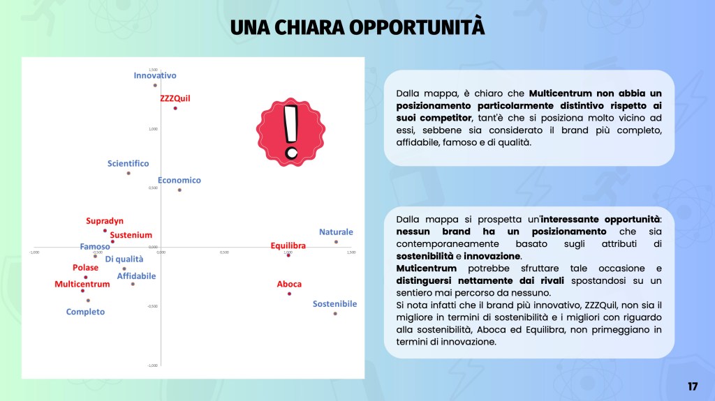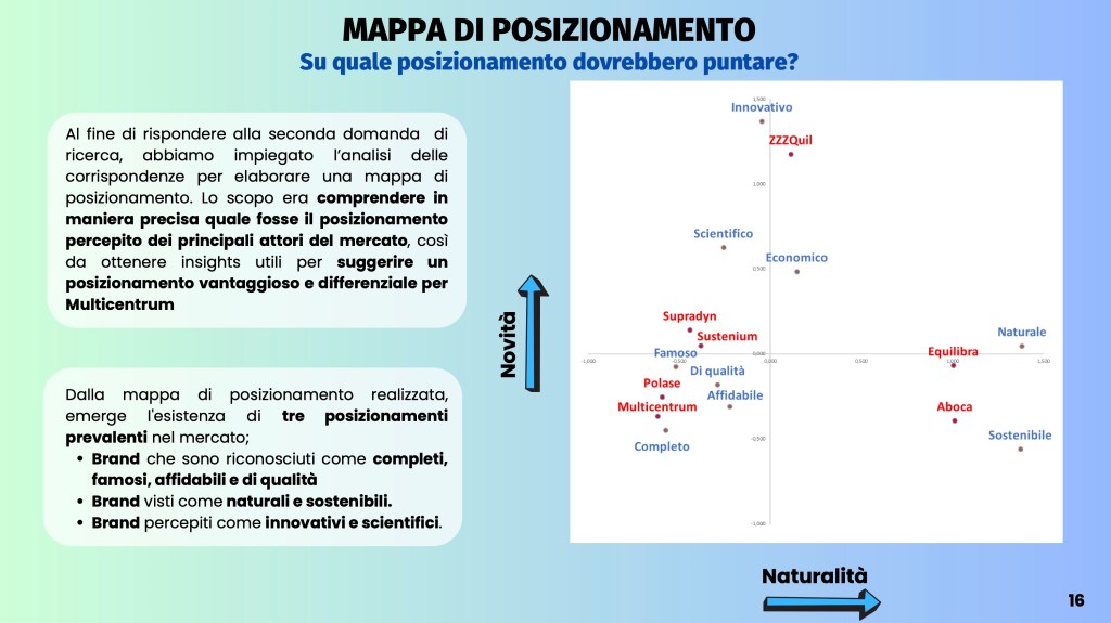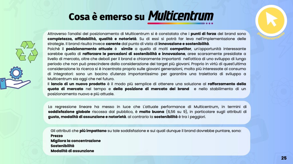 Ciò che è emerso dall’analisi è che, poiché il posizionamento attuale di Multicentrum è simile a quello di molti competitor, un’opportunità interessante sarebbe quella di rafforzare le percezioni di sostenibilità e innovazione, aree scarsamente presidiate a livello di mercato, oltre che deboli per il brand e chiaramente importanti nell’ottica di uno sviluppo di lungo periodo, che non può prescindere dalla considerazione dei target più giovani. Proprio in virtù di quest’ultima considerazione, la ricerca si è incentrata sulle giovani generazioni, molto più interessate al consumo di integratori: sono un bacino d’utenza importantissimo per garantire una traiettoria di sviluppo a Multicentrum, sia oggi che nel futuro.