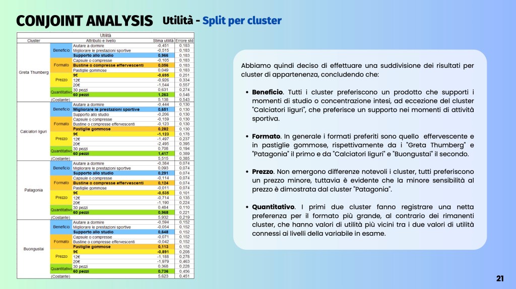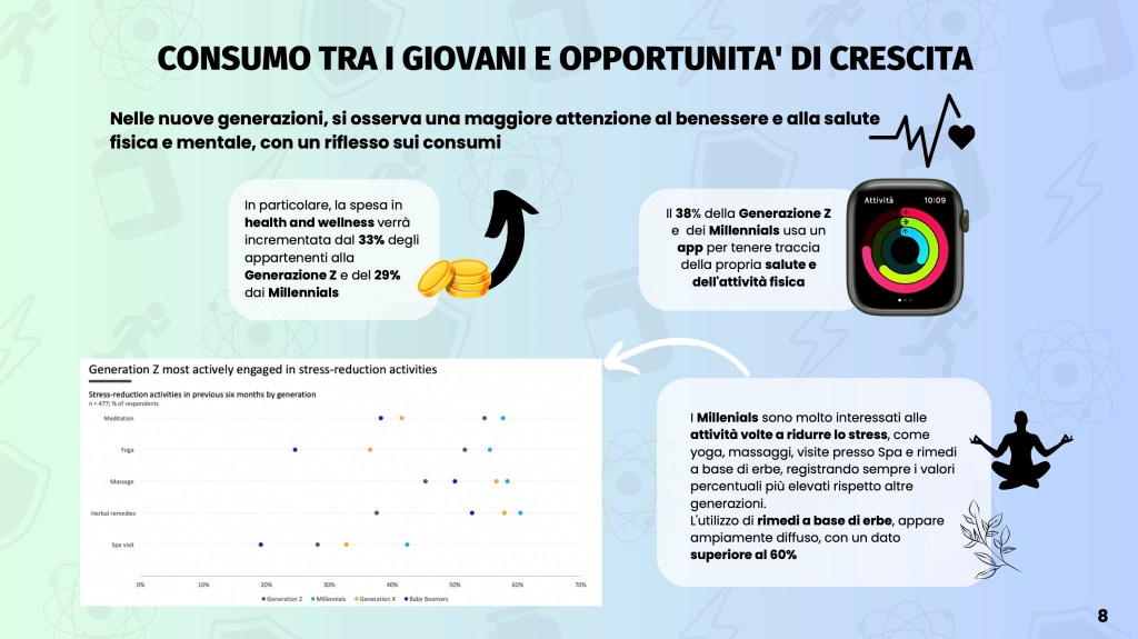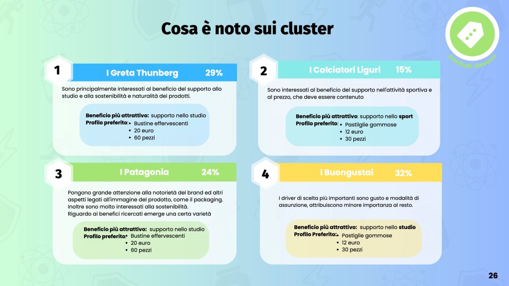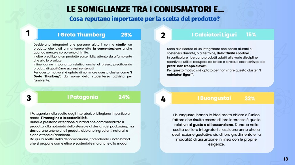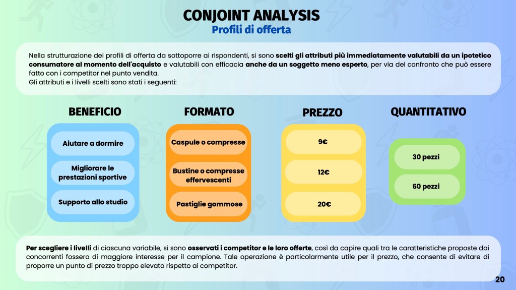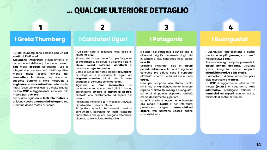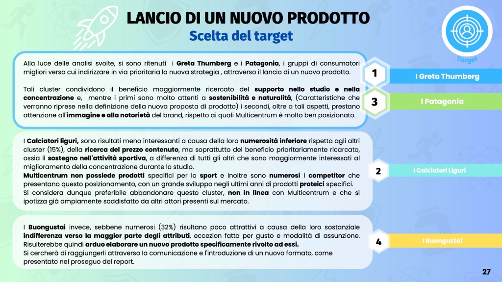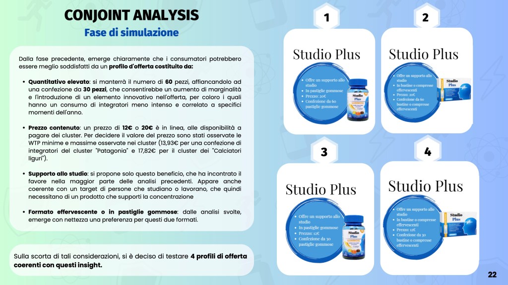Ciò che è emerso dall’analisi è che, poiché il posizionamento attuale di Multicentrum è simile a quello di molti competitor, un’opportunità interessante sarebbe quella di rafforzare le percezioni di sostenibilità e innovazione, aree scarsamente presidiate a livello di mercato, oltre che deboli per il brand e chiaramente importanti nell’ottica di uno sviluppo di lungo periodo, che non può prescindere dalla considerazione dei target più giovani. Proprio in virtù di quest’ultima considerazione, la ricerca si è incentrata sulle giovani generazioni, molto più interessate al consumo di integratori: sono un bacino d’utenza importantissimo per garantire una traiettoria di sviluppo a Multicentrum, sia oggi che nel futuro.