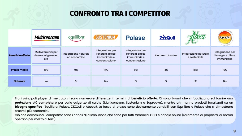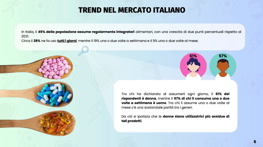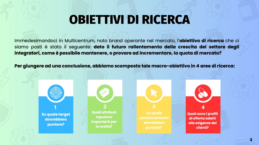 Di fronte a tale scenario, il team, composto da Riccardo Foffano, Ilaria Fogli e Filippo Vimercati, studenti di Marketing Management dell’Università Bocconi, ha assunto la prospettiva dell’azienda Multicentrum e ha effettuato ricerche desk e quantitative per comprendere le opportunità di crescita ed incremento delle vendite che si affacciano nell’odierno contesto del mercato degli integratori.
