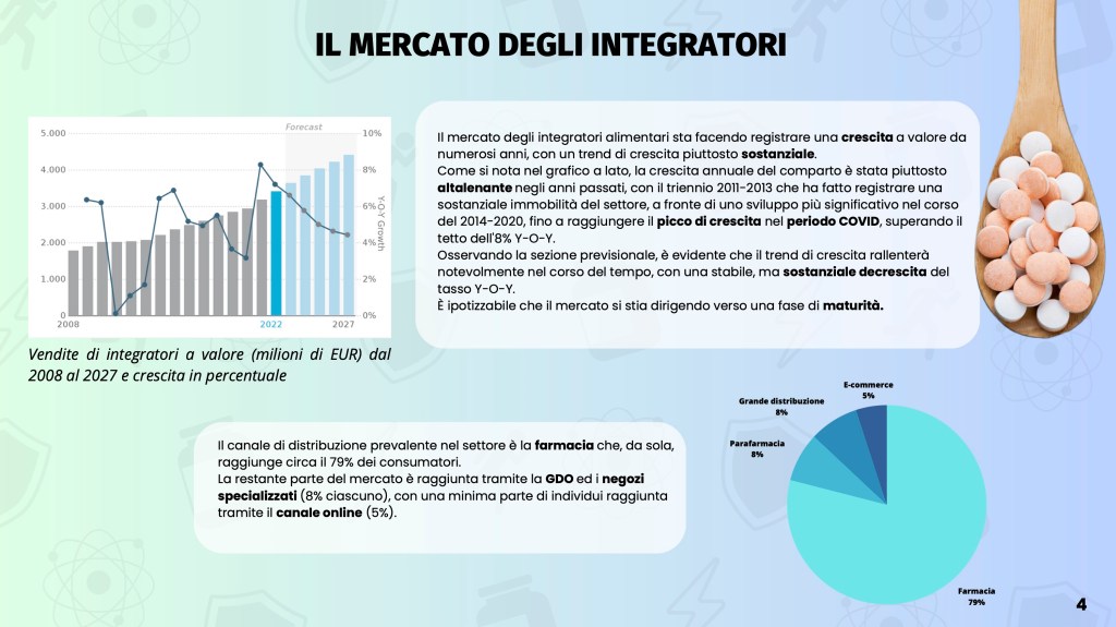 Il mercato di vitamine e integratori è stato interessato da una rapida crescita durante il picco di diffusione della pandemia di COVID-19. Tuttavia, varie analisi previsionali mostrano come il trend di crescita sia destinato a rallentare, rendendo lecito ipotizzare che il mercato si stia dirigendo verso una fase di maturità.